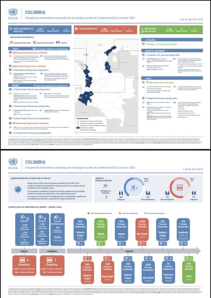 Desde que comenzó la emergencia sanitaria, que llevó al Gobierno a anunciar un encierro y aislamiento obligatorios, según el último informe de la Oficina de Asuntos Humanitarios de las Naciones Unidas -OCHA- se han registrado más de una docena (12) emergencias humanitarias relacionadas con acciones principalmente en el marco del conflicto armado y dos (2) relacionadas con desastres naturales. En el tiempo transcurrido desde la aparición del virus en el país, se han producido más emergencias humanitarias que las registradas de enero a febrero de 2020, y todas ellas han sido atendidas tanto por organismos de las Naciones Unidas como por otras organizaciones humanitarias en un contexto en el que no sólo hay una exposición al virus, sino también varias amenazas a la seguridad que han aparecido como resultado de la COVID-19 junto con las amenazas tradicionales relacionadas con el conflicto armado en Colombia