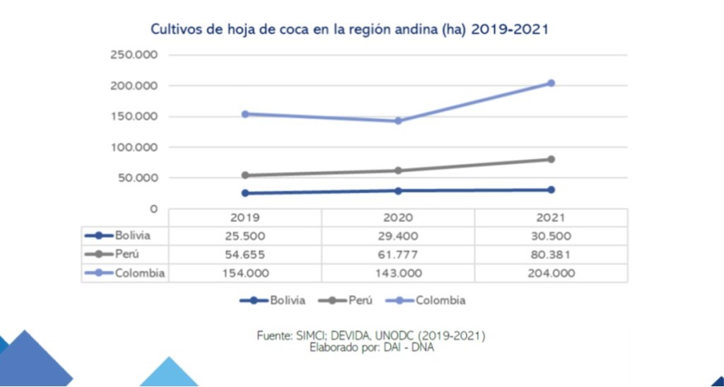 1) si bien los cultivos de hoja de coca entre los tres países aumentaron de 234.635 hectáreas en el año 2019 a 314.881 hectáreas en el 2021, la distribución porcentual de cultivos de hoja de coca entre los tres países no ha variado con el tiempo.