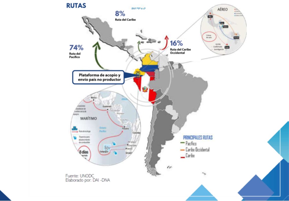 El conjunto de riesgos y debilidades, han convertido al Ecuador en una plataforma priorizada para el acopio y envío de droga a los mercados internacionales mediante las modalidades de tráfico marítimo, terrestre y aéreo.