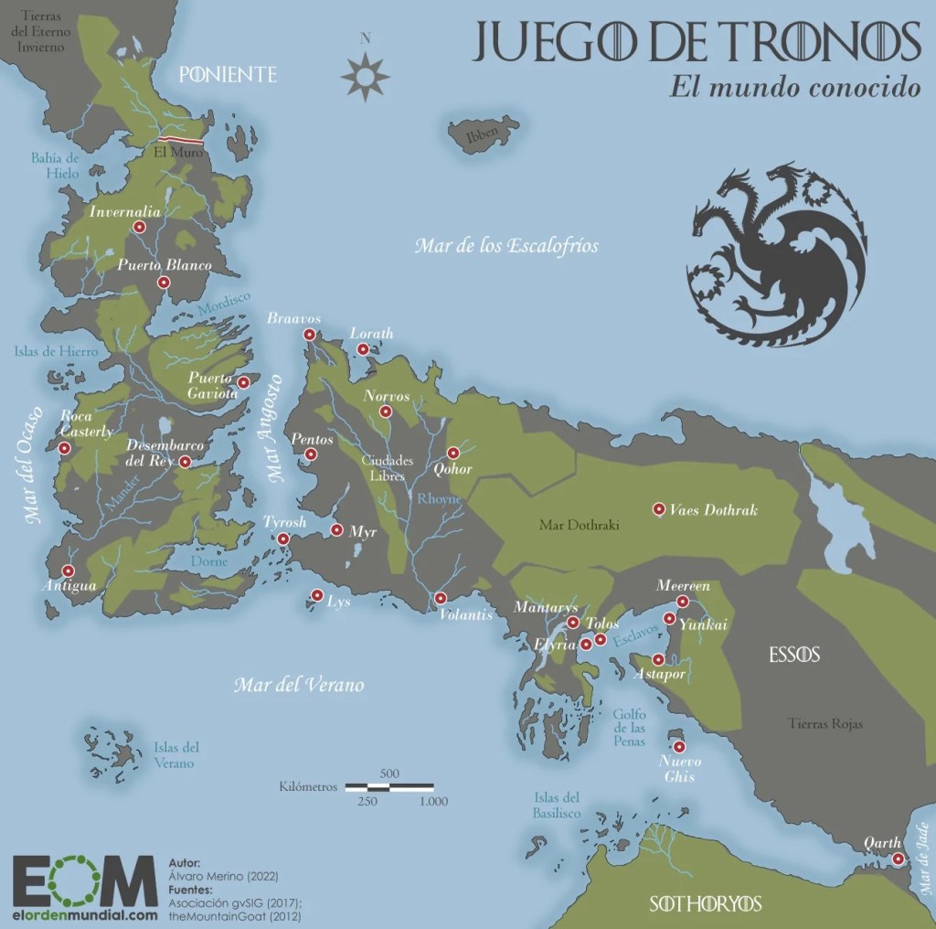 Aunque el mapa de ‘Juego de tronos’ y su precuela ‘La casa del dragón’ no cuenta con una versión completa, los recortes cartográficos de los libros y las series dividen «el mundo conocido» en tres extensos continentes