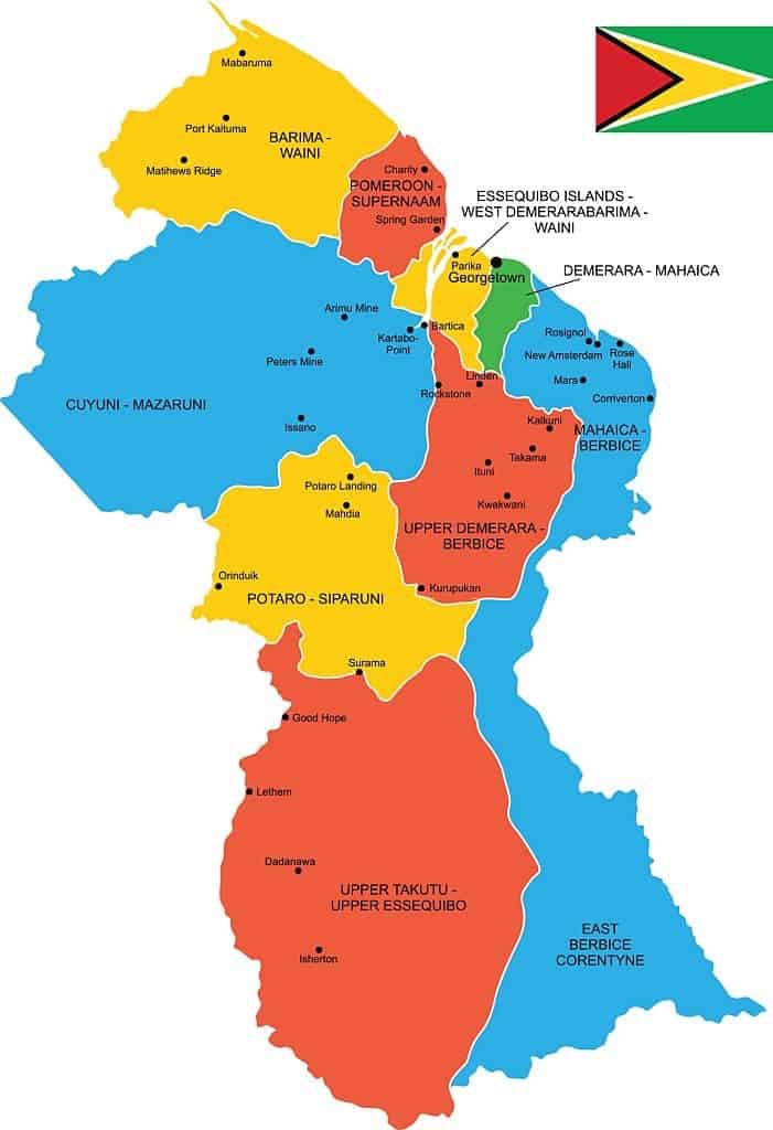 Guyana es un país pequeño y poco poblado situado en la costa nororiental de Sudamérica . Limita al oeste con Venezuela, al oeste con Brasil y Suriname, y al norte con el océano Atlántico.