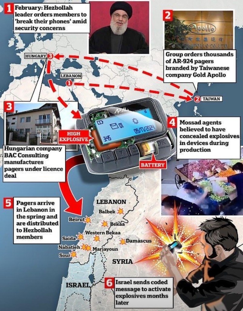 Funcionarios estadounidenses y de otros países citados por la prensa aseguraron que las explosiones se produjeron como resultado de la implantación por parte de Israel de material explosivo en un lote de beepers importado recientemente a Líbano.