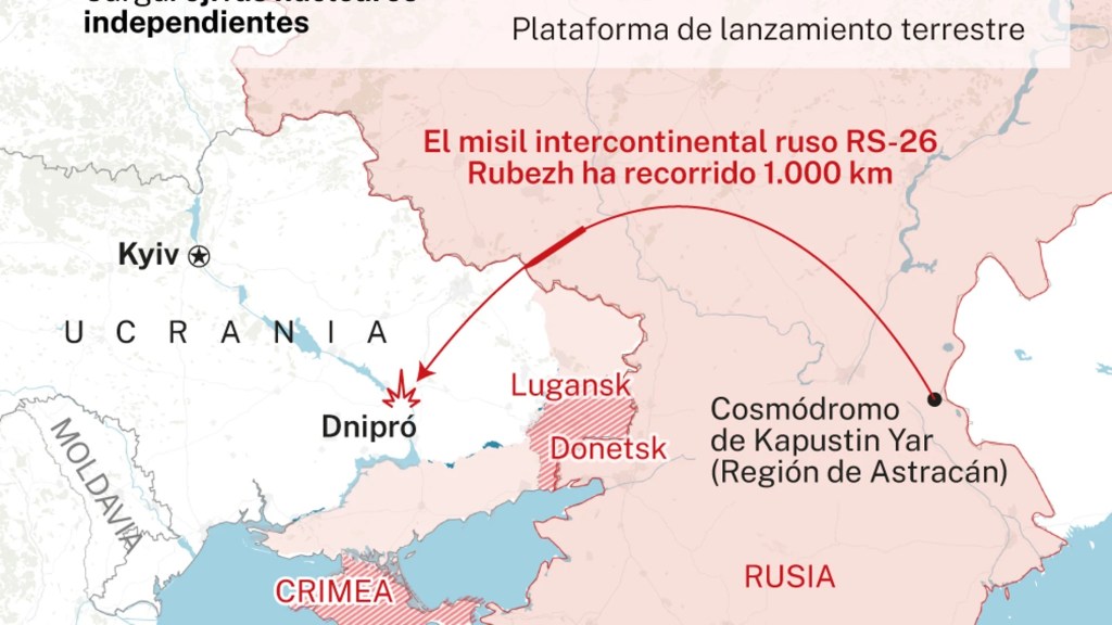 Rusia confirmó el jueves que, en respuesta a bombardeos ucranianos con proyectiles occidentales, disparó su nuevo misil «Oreshnik» de medio alcance (hasta 5.500 km) contra un emplazamiento militar en Dnipró, en el centro-este de Ucrania.