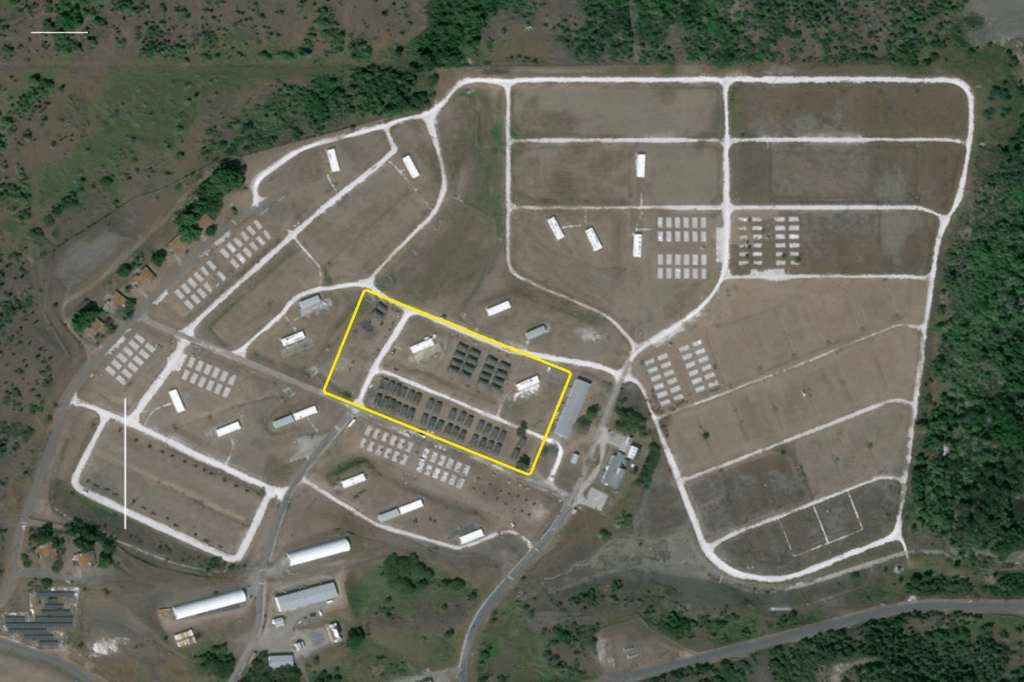 Las posiciones de las tiendas de campaña vistas en las imágenes de satélite de esta semana parecen seguir esos planes de diseño. También se puede ver la infraestructura de apoyo, etiquetada en los planos como comedores y cuartel general del campamento, en preparación sobre plataformas de cemento que se construyeron en 2019.