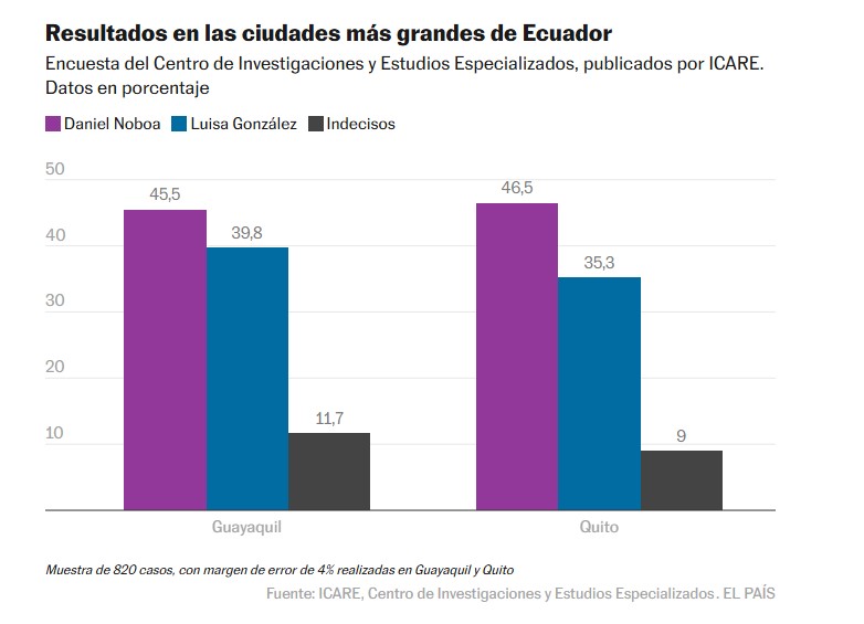 Los datos de la encuesta revelan que, en Guayaquil, un 45.5% de los consultados se inclinan por el mandatario, frente a un 39.8% que prefiere a su contrincante. En Quito, el panorama es similar: un 46.5% de los encuestados optaría por Noboa, mientras que un 35.3% lo haría por González.