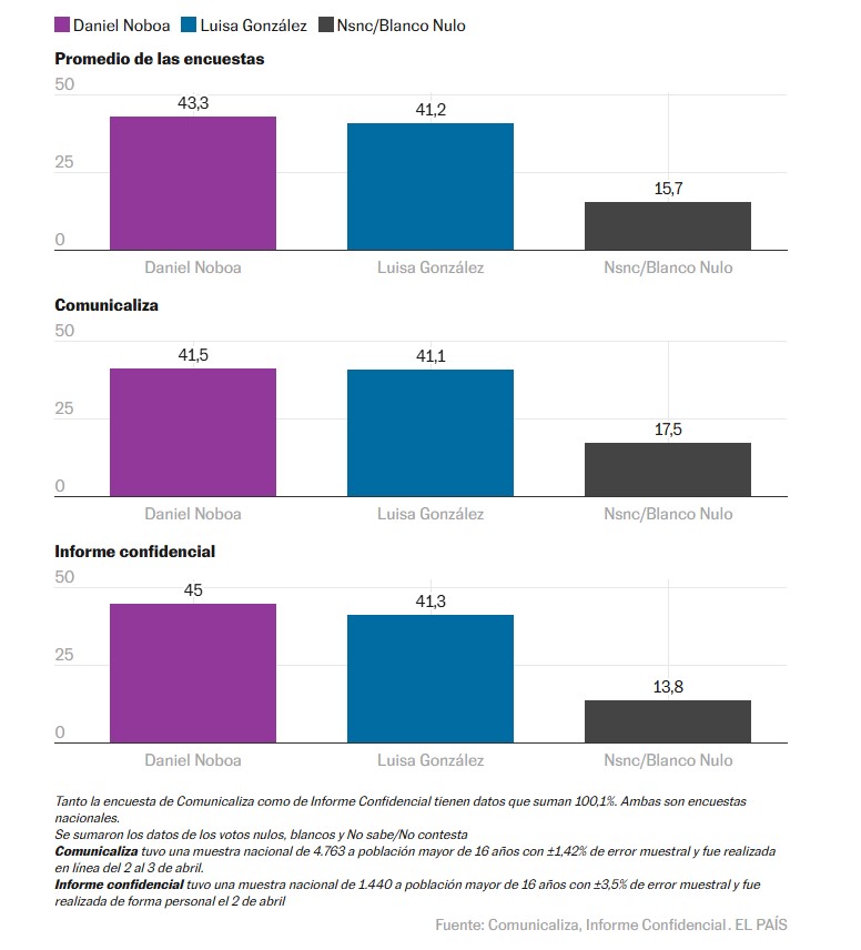 Actualmente la paridad entre los dos candidatos es máxima. Según el último análisis de la consultora Icare, basado en un estudio cuantitativo del Centro de Investigaciones y Estudios Especializados, Noboa mantiene una ligera ventaja sobre González.
