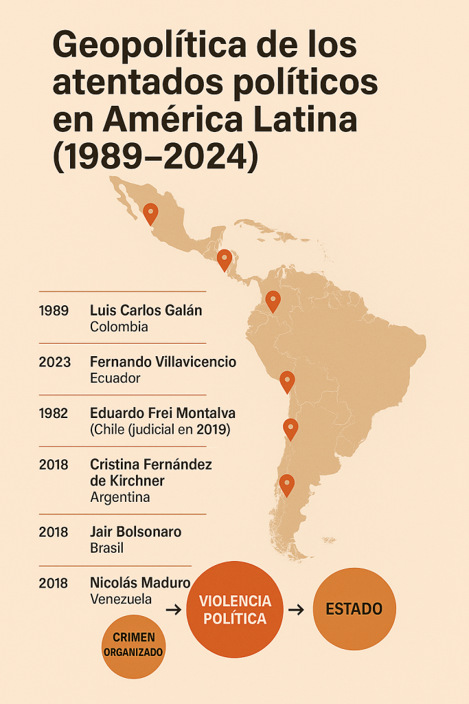 En los últimos 35 años, América Latina ha sido escenario de múltiples atentados contra líderes políticos, candidatos presidenciales, activistas y exmandatarios. Lejos de ser hechos aislados, estas acciones violentas responden a una lógica geopolítica interna y regional: son expresiones de poder, mecanismos de control, y herramientas de disuasión o eliminación selectiva en escenarios donde el crimen, la política y el Estado convergen.
