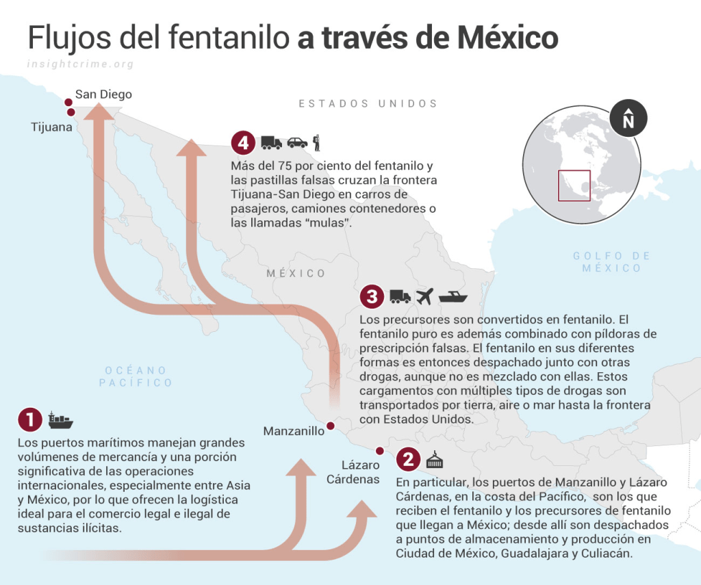 Según indica La DEA, el fentanilo es hoy el vector más letal del mercado ilícito de drogas en Norteamérica. Su poder (≈100 × morfina) y la facilidad para sintetizarlo a partir de precursores químicos lo convirtieron en el corazón de una cadena logística transnacional que inicia en Asia, se ensambla en México y desemboca -sobre todo- por pasos fronterizos legales hacia Estados Unidos.