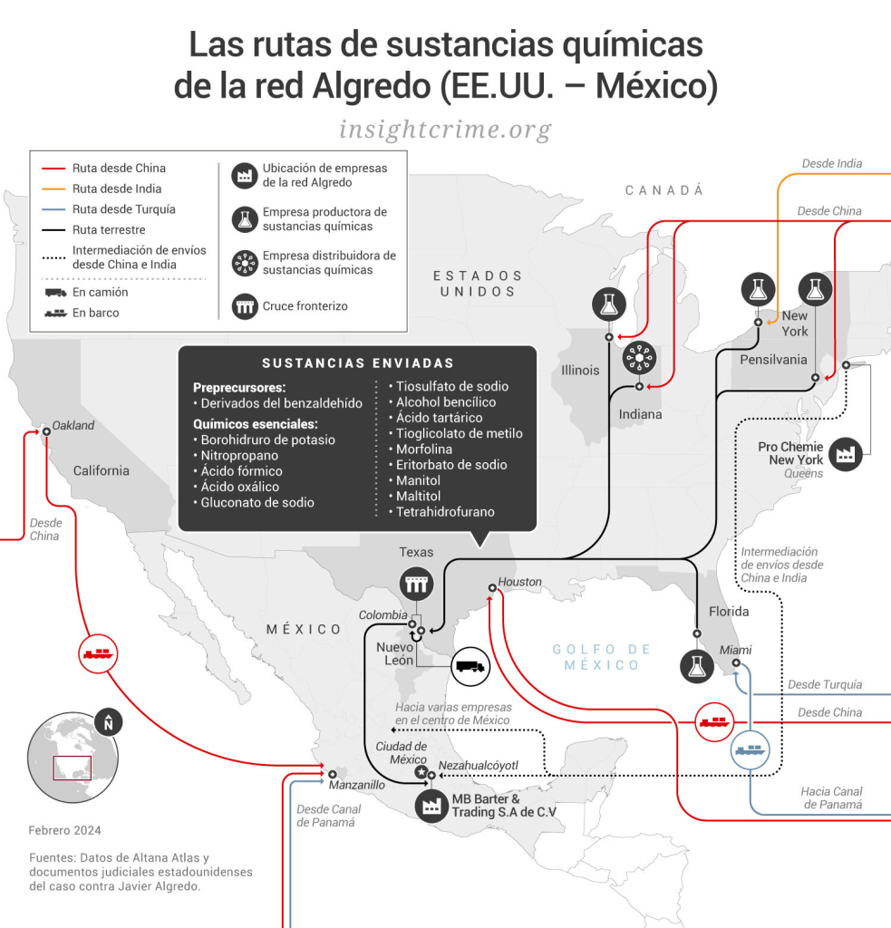 - Los puertos de entrada a México son Manzanillo (Colima) y Lázaro Cárdenas (Michoacán), nodos críticos para el ingreso de cargamentos químicos; la prensa y reportes especializados documentan también flujos desde Brasil, India y Alemania.