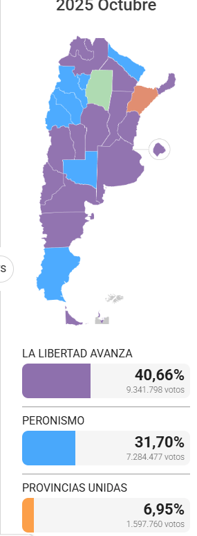 El domingo 26 de octubre de 2025, en las elecciones legislativas de mitad de mandato argentinas, La Libertad Avanza obtuvo una votación de ~40 % a nivel nacional, superando con amplitud al peronismo en su conjunto (≈ 31 %) y logrando un vuelco simbólico en provincias clave como Buenos Aires, Córdoba, Santa Fe y Mendoza.